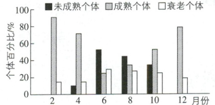 体所占的比例不同,因此,季节的更替会影响该种群的年龄结构,A正确;6—8月该种群未成熟个体所占的比例最大,其年龄结构属于增长型,B错误;由图可知,未成熟个体从2月底到6月底从零逐渐增多,从6月底到12月底逐渐减少至零,而该动物个体从出生到性成熟需要6个月,12月底都性成熟,因此该种群出生时间可能在3月到6月之间,C正确;大量诱杀雄性个体会破坏性别比例,进而影响种群的出生率,种群中的幼年个体数量减少,从而可能使种群年龄结构变为衰退型,D正确。