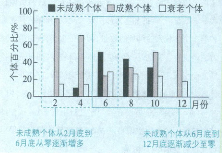 未成熟个体从2月底到6月底从零逐渐增多 未成熟个体从6月底到12月底逐渐减少至零