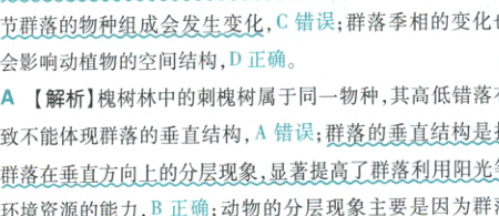 6.A 【解析】槐树林中的刺槐树属于同一物种,其高低错落有致不能体现群落的垂直结构,A错误;群落的垂直结构是指群落在垂直方向上的分层现象,显著提高了群落利用阳光等环境资源的能力,B正确;动物的分层现象主要是因为群落的不同层次提供不同的栖息空间和食物条件,故不同种类的淡水鱼占据不同水层而出现分层现象与各种淡水鱼的食性有关,C正确;在水平方向上,不同地段往往分布着不同的种群,它们常呈镶嵌分布,属于群落的水平结构,D正确。