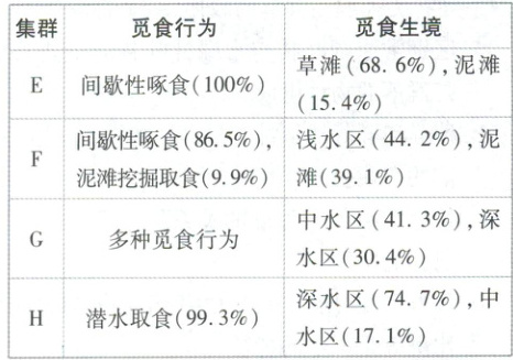 9. [北京陈经纶中学2024高二月考]某湖泊是越冬水鸟的重要聚集区。科研人员将湖中水鸟划分为4个集群(每个集群包括若干种水鸟),并对它们的觅食行为和觅食生境进行调查,结果如表所示(百分比代表使用频率)。下列说法正确的是(