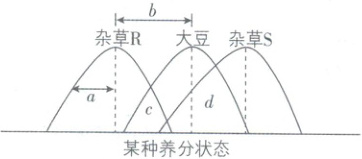 大豆与杂草R的生态位重叠区域c比大豆与杂草S的生态位重叠区域d小,故大豆与杂草R对该养分的竞争程度比大豆与杂草S弱,B错误