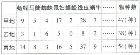 1. [陕西咸阳2025高二月考]某学校生物兴趣小组利用课外时间进行了“研究土壤中小动物类群丰富度”的探究活动,在不同地块中获得的部分实验数据如表所示(种群数量的单位为只,甲地、乙地和丙地的面积相等)。下列叙述正确的是(