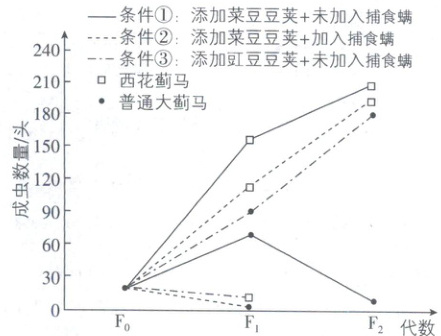 4. [山东德州2024高二期末]普通大蓟马和西花蓟马是寄生在豆科作物上的两种害虫,捕食螨是两者共同的天敌。为明确两种蓟马的种间竞争情况,给予三种不同的培养条件,在每种条件下同时培养两种蓟马,分别统计了两种蓟马成虫数量的变化,结果如图所示。下列说法错误的是(