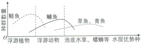 1. [北京人大附中2025高二月考]中国悠久的淡水渔业养殖历史中,人们发明了高产低耗的“四大家鱼混养技术”。如图为夏季一个池塘中鱼的种群数量与水层优势种之间的关系曲线。下列相关叙述错误的是(