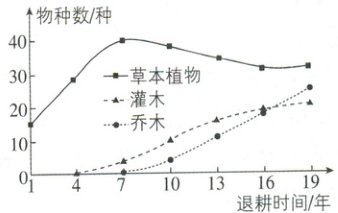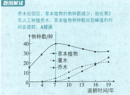 乔木出现后,草本植物的物种数减少,故在第2年人工种植乔木,草本植物物种数出现峰值的时间会提前,A错误 【解析】分析题图可知,随着退耕时间的延长,群落物种数逐渐增多,群落的垂直分层更加复杂,即群落对光能等环境资源的利用更充分,B正确;群落演替过程中,前一阶段为后一阶段的形成提供了适宜条件,C正确;植物为动物提供食物和栖息场所,群落演替主要表现为植物的更替,动物也发生更替,D正确。