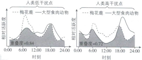 (3)据题图解读可知,如果大型食肉动物和梅花鹿每天的活动次数不变,在人类高干扰时,梅花鹿与大型食肉动物的重叠度减小,不利于大型食肉动物捕食。