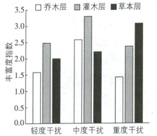 (2)据图可知,在中度干扰下群落各结构层物种丰富度均有所上升,但随着干扰的进一步增强,群落中只有草本层的丰富度持续增大。从群落垂直分层及资源利用特征的角度分析,其原因是
