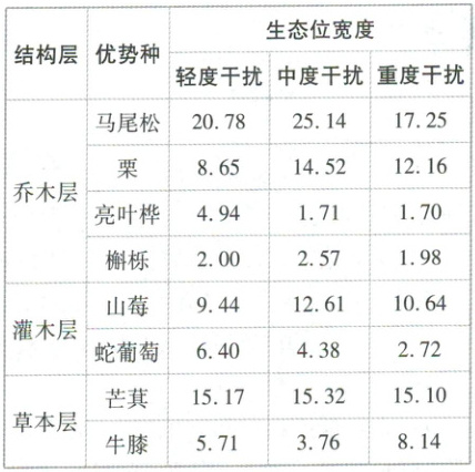 (1)据题表1可知,不同优势种对人为干扰强度的响应不同,其中芒萁的生态位宽度在不同干扰强度下的波动最小,故该群落中受人为干扰影响最小的优势种是芒萁。在人为干扰影响下,种间竞争减少,可利用的环境资源增多。