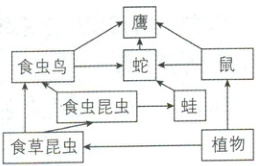 2.B 【解析】蓝细菌、硫细菌等原核生物能利用光能或化学能将无机物转变为有机物,能充当生产者,A错误;若食虫鸟被人类大量捕杀,短期内食草昆虫可能因天敌减少而数量增多,导致植物虫害严重,B正确;生产者、消费者和分解者均是维持一个生态系统存在的不可缺少的成分,C错误;据图可知,该食物网共由7条食物链组成,分别是植物→食草昆虫→食虫鸟→鹰、植物→食草昆虫→食虫昆虫→食虫鸟→鹰、植物→食草昆虫→食虫鸟→蛇→鹰、植物→食草昆虫→食虫昆虫→食虫鸟→蛇→鹰、植物→食草昆虫→食虫昆虫→蛙→蛇→鹰、植物→鼠→鹰、植物→鼠→蛇→鹰,鹰为最高营养级,D错误。