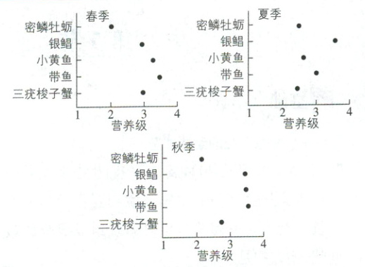 4. [福建泉州四校2025高二联考]科研人员为研究某近海食物网的季节性变化,采用测量生物不同组织中13^C、15^N的含量,按公式计算获得了部分生物的平均营养级,结果如图。下列叙述正确的是(