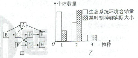 (1)由图甲分析可知,B、F只有指出的箭头,属于生产者;A、C、D、G有由生产者指入的箭头,属于初级消费者;A、D、E、G、H有由初级消费者指入的箭头,属于次级消费者。
