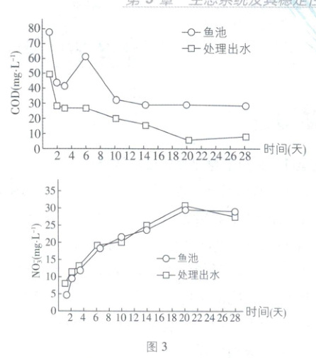 与鱼池相比,处理出水水中COD值明显下降,而NO₃⁻含量没有明显变化,说明该生态净化系统对有机物去除效果较好