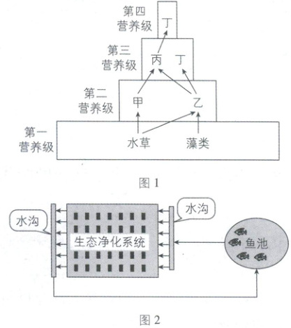 6. [河南商丘百师联盟2025高二联考]图1表示某河流生态系统的食物网及该生态系统的营养级分布(甲、乙、丙为3种鱼,均可被丁捕食,丁为1种肉食性水鸟,甲、丙不摄食藻类,箭头指示捕食情况)。图2为小型景观鱼池生态循环净化系统,生态净化系统内引入芦苇等多种水生植物以及螺蛳、草鱼、鳙鱼等物种,以达到对污水的协同净化效果。回答下列问题: