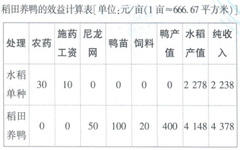 。(3)据表可知,与传统水稻种植相比,稻田养鸭取得了明显的生态效益和经济效益,具体表现为