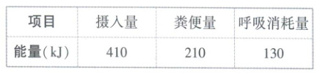 8.B [解析]昆虫的同化量=摄入量-粪便量=410-210=200(kJ),A错误;昆虫的粪便量属于上一营养级(植物)同化量的一部分,B正确;同化量-呼吸消耗量=昆虫用于生长、发育和繁殖的能量,C错误;储存在昆虫体内有机物中的能量为同化量-呼吸消耗量=200-130=70(kJ),D错误。