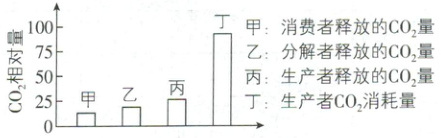 B 【解析】流经该森林生态系统的总能量是生产者固定的太阳能总量,可用丁表示,A错误;由图可知,CO₂消耗量(丁)大于CO₂释放量的总和(甲+乙+丙),说明该森林生态系统的生产量增加,这可能是生产者的种类和数量增加所引起的,即该森林生态系统的物种丰富度可能正在增加,B正确;碳在该生物群落内部以含碳有机物的形式沿食物链和食物网进行单向传递,C错误;人工生态系统中可能出现CO₂消耗量较小、CO₂释放量较大的情况,可能不符合该图,D错误。