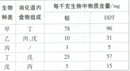 5. 教材变式[辽宁名校联盟2025高二联考]某研究小组开展了对某湖泊污染问题的研究,他们首先选取了该湖泊中能构成食物网的5种不同生物甲、乙、丙(生产者)、丁、戊,并对其进行消化道内食物组成分析;然后又请当地湖泊研究所的专家对两种在生物体内难以分解的物质的含量进行了测定,结果如表所示。下列说法错误的是(