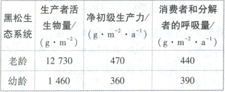 C 【解析】根据题意可知,黑松老龄生态系统用于生产者当年的生长、发育和繁殖的碳量可用图中的净初级生产力来表示,即470g·m⁻²·a⁻¹,A正确;储存在生产者活生物量中的碳最终均会以CO₂的形式返回大气中的CO₂库,B正确;碳在黑松老龄生物群落和黑松幼龄生物群落中都是以含碳有机物的形式进行传递的,C错误;黑松老龄生态系统的净初级生产力为470g·m⁻²·a⁻¹,大于消费者和分解者的呼吸量(440g·m⁻²·a⁻¹),因此黑松老龄生态系统能降低大气中的碳总量,D正确。