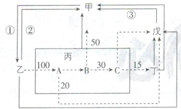 2. [江西六校2025高二联考]如图为某生态系统中碳循环的部分示意图,图中甲~戊代表不同组成成分,①~③表示过程,A、B、C代表能量流经丙所处营养级的去向,其中数字代表能量值,单位为$J/(cm^2·a)。$下列叙述正确的是( )