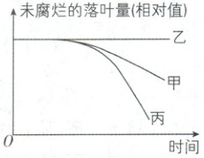 A 思路导引 分析题图可知,乙组落叶没有被分解,为经过灭菌的带有落叶的表层土;甲组和丙组随时间延长,未腐烂落叶量均减少,丙组减少得更快、更多,故甲组是没有经过灭菌处理的土壤,丙组是带有落叶的表层土经灭菌后加入催腐剂。