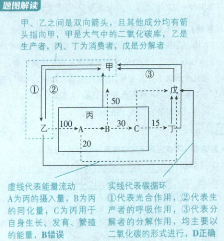 【解析】由题图解读可知,戊为分解者,不是食物链中的营养级,而丁处于食物链的最高营养级,所以丁中富集物含量最高,A错误;乙为生产者,丙为初级消费者,丁为次级消费者,一般情况下,生产者的数量多于消费者,但也存在特殊情况,比如一棵树上有很多昆虫(初级消费者),此时初级消费者数量多于生产者,所以乙、丙、丁三种成分的数量关系不一定依次递减,C错误。