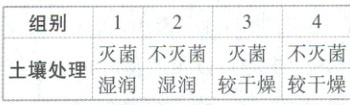 (3)实验设置:1、2组形成对照,探究湿润情况下土壤灭菌对落叶分解的影响;3、4组形成对照,探究干燥情况下土壤灭菌对落叶分解的影响;2、4组形成对照,探究土壤湿润程度对土壤微生物分解作用的影响。