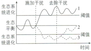 3.D 【解析】生态系统的自我调节能力是有一定限度的,当生态系统能量输入长期小于输出时,生态系统的稳定性将下降,A正确;由图可知,当正干扰超过阈值后,生态系统会向更加优化的方向进化,B正确;当负干扰超过生态系统的自我调节能力阈值时,生态系统可能会退化,C正确;在负干扰消失后,退化的生态系统要经历很长时间才能恢复到退化前的状态(如图中的曲线2),甚至不能恢复(如图中的曲线3),D错误。