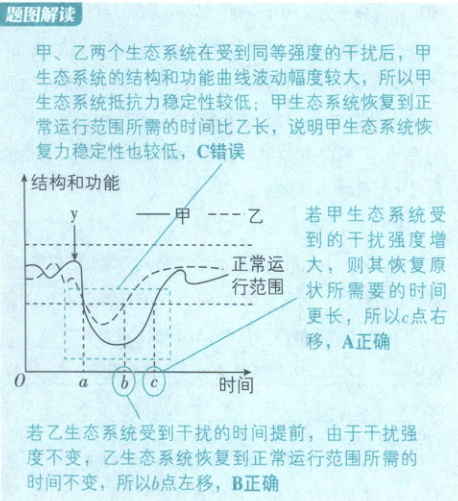 甲、乙两个生态系统在受到同等强度的干扰后,甲生态系统的结构和功能曲线波动幅度较大,所以甲生态系统抵抗力稳定性较低;甲生态系统恢复到正常运行范围所需的时间比乙长,说明甲生态系统恢复力稳定性也较低,C错误 若甲生态系统受到的干扰强度增大,则其恢复原状所需要的时间更长,所以c点右移,A正确 若乙生态系统受到干扰的时间提前,由于干扰强度不变,乙生态系统恢复到正常运行范围所需的时间不变,所以b点左移,B正确 【解析】受到干扰后再恢复,群落会发生演替,物种组成可能会发生变化,所以乙生态系统b点后的物种组成与a点之前可能不同,D正确。