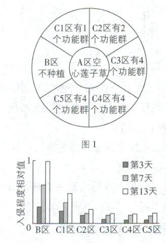 3. [重庆巴蜀中学 2025 高二月考]为研究某生态系统的植物功能群对空心莲子草入侵的影响,科研人员将一个圆形样地划分为 A 区、B 区和 C1~C5 区,除 A 区外,其余各区面积相同。各区种植情况如图 1 所示,其中 C3~C5 区中植物功能群数目相同但物种数目分别为 4、8、16。第 3、7、13 天测定 B、C 区空心莲子草入侵状况,得到图 2 所示结果。下列叙述正确的是( )