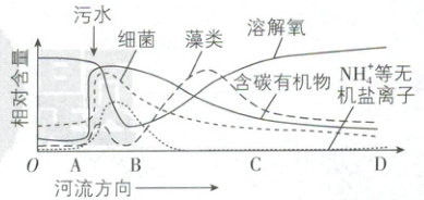 【解析】由题意可知,该图表示某河流生态系统受到生活污水(含大量有机物)轻度污染后的净化作用示意图,体现了生态系统具有一定的自我调节能力,说明该河流生态系统具有抵抗力稳定性,A正确;流入该河流中的细菌等分解者的能量来自动植物的遗体残骸中的化学能和污水有机物中的化学能,B错误;藻类进行光合作用可释放氧气,需氧细菌分解有机物时消耗大量氧气,据图中曲线可知,AB段溶解氧大量减少的主要原因是藻类数量的减少和需氧细菌的大量繁殖,C正确;BC段含碳有机物在减少,说明有机物被大量分解,产生NH₄⁺等无机盐离子,使藻类大量繁殖,D正确。