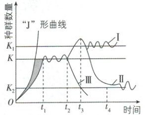 D.当种群数量在 $ t_{3} $ 后的变化曲线为Ⅱ,$ t_{3} $ 可能的外界因素为食物减少、活动范围缩小