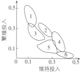 2. [广东佛山 2025 期末]在自然选择过程中,每个物种在特定生态环境下的适应策略不同。繁殖投入(用于生殖器官发育、交配、生产抚育后代所需的能量)比例较高的称为 r-对策者,维持投入(用于维持静态基础代谢、寻找和摄取食物所需的能量)比例较高的称为 K-对策者。如图为一枝黄花属的 6 个种群的繁殖投入与维持投入的散点图。下列叙述错误的是(