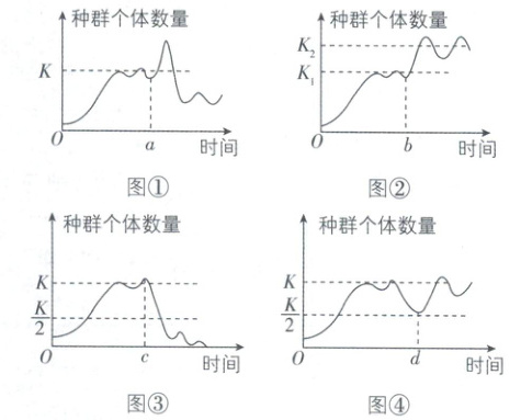 A [解析]图③中c时间后种群数量急剧减小,可能是外界环境发生变化,如生态系统遭到严重破坏,A错误;若图②所示为某发酵罐中酵母菌的种群数量,则b时间后变化的原因可能是增加了营养供应,导致种群数量上升,稳定在新的K值,B正确;若图①所示为海洋中某鱼类的种群,a时间种群数量在K值附近,a时间后种群数量快速增大,而后减少并稳定在新的较低K值附近,原因可能是大量放养了该种鱼类,C正确;图④中显示种群数量降低到$\frac{K}{2}$时能迅速恢复原有状态,可用于指导海洋捕捞,即捕捞后维持种群数量在$\frac{K}{2}$左右,D正确。