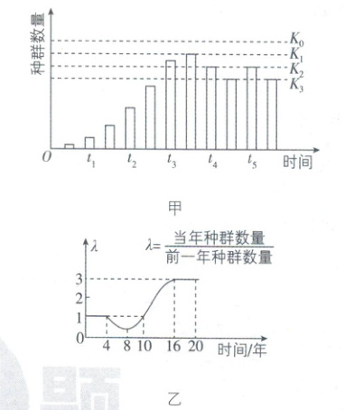 (2)分析图甲可知,在$0→t_3$时段内,野兔种群的数量逐渐增加,随后趋于稳定,其种群增长曲线呈“S”形。在$t_3$之后,种群数量增长减慢,之后种群数量有所降低,说明环境阻力加大,因此$t_3$时,最可能有天敌迁入。结合图甲可知,当天敌进入后,经过一段时间发展后,达到环境容纳量,在捕食压力下,野兔种群的环境容纳量将在$K_2~K_3$波动。