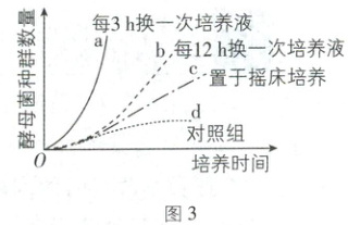 (3) 该小组成员又用 4 种不同方式培养酵母,其他培养条件相同,实验操作正确。酵母菌种群数量增长曲线分别为 a、b、c、d,如图 3 所示。