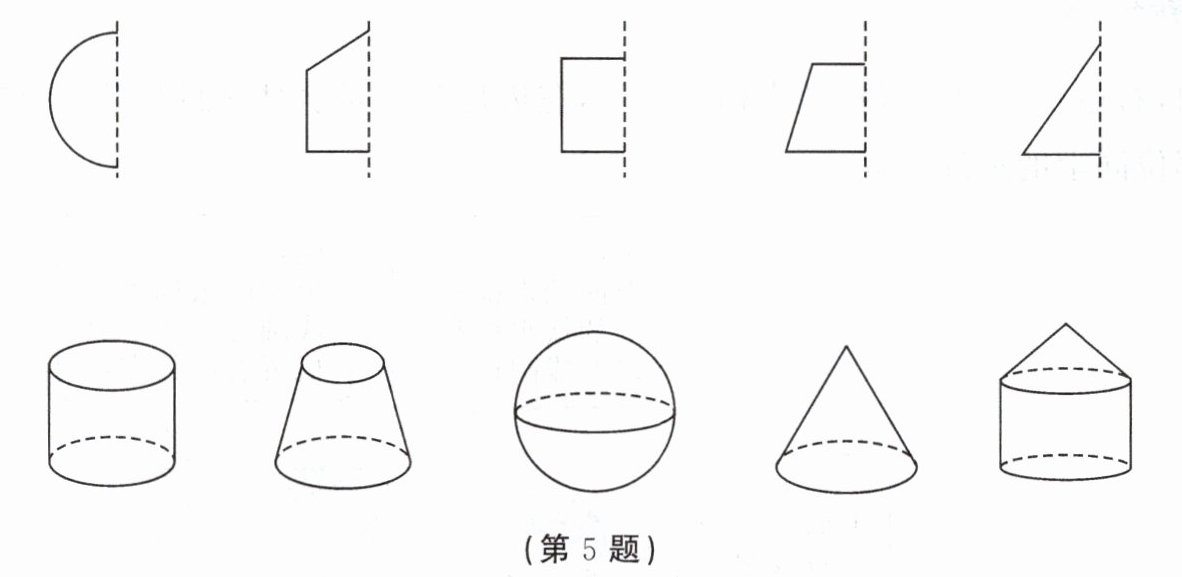 5. 第一行的平面图形绕虚线旋转一周能得到第二行的一个几何体,请用线连接起来。