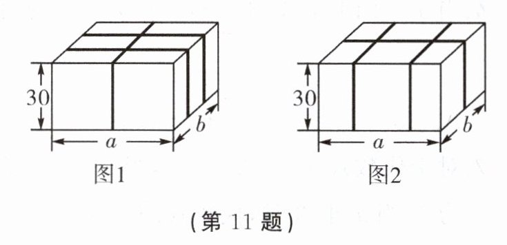 11. 火车站、机场、邮局等场所都有为旅客提供打包服务的项目。现有一个长、宽、高分别为 $ a cm $,$ b cm $,$ 30 cm $ 的箱子(其中 $ a > b $),准备采用如图 $ 1 $、图 $ 2 $ 所示的两种打包方式,所用打包带的总长(不计接头处的长)分别记为 $ l _ { 1 } $,$ l _ { 2 } $。