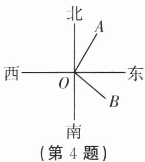 4. 如图,$ A $ 地和 $ B $ 地都是海上观测站,$ A $ 地在灯塔 $ O $ 的北偏东 $ 30^{\circ} $ 方向,$ \angle AOB = 100^{\circ} $,则 $ B $ 地在灯塔 $ O $ 的