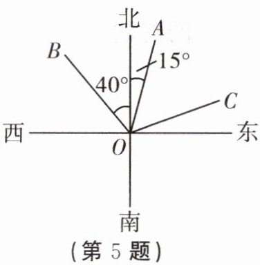 5. 如图,射线$OA$的方向是北偏东$15^{\circ}$,射线$OB$的方向是北偏西$40^{\circ}$。若$∠AOC=∠AOB$,则射线$OC$的方向是