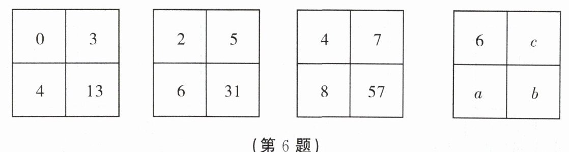 6. 填在下面各正方形中的四个数之间都有相同的规律,根据这种规律,可知 $ a + b + c =$(