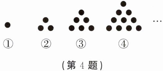 4. 古希腊数学家毕达哥拉斯发现:数量为 $ 1,3,6,10,·s $ 的圆点,可以排成三角形,如图所示. 我们把 $ 1,3,6,10,·s $ 这样的数称为“三角形数”. 根据图中点的数量规律,第 $ n $ 个“三角形数”可表示为