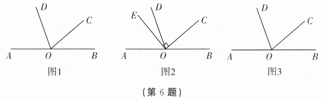 6. 如图1,点$A$,$O$,$B$在同一条直线上,$∠BOC=40^{\circ}$,$OD$平分$∠AOC$。从点$O$出发画一条射线$OE$,使得$∠COE=90^{\circ}$。请画出满足条件的射线$OE$,并求出$∠DOE$的度数。