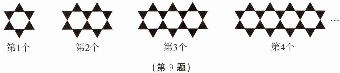 9. 如图所示的是一组有规律的图案,它们是由正三角形组成的,第 1 个图案中有 6 个正三角形,第 2 个图案中有 10 个正三角形,第 3 个图案中有 14 个正三角形……按此规律,第 $ n $ 个图案中有