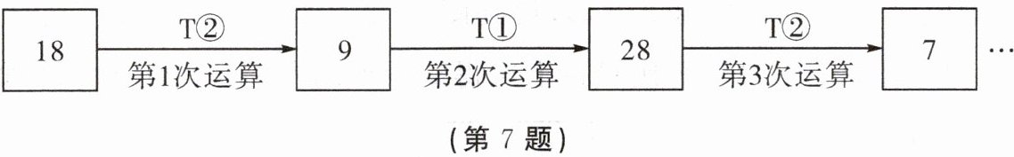 7. 定义一种正整数 $ n $ 的“T”运算:①当 $ n $ 为奇数时,结果为 $ 3n + 1 $;②当 $ n $ 为偶数时,用 $ n $ 连续除以 2,直到结果为奇数停止,并且运算重复进行. 例如,当 $ n = 18 $ 时,运算过程如图所示: