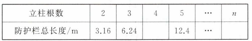 (2)解:当防护栏总长度为74m时,3.08n - 3 = 74,解得n = 25.故立柱的根数为25.