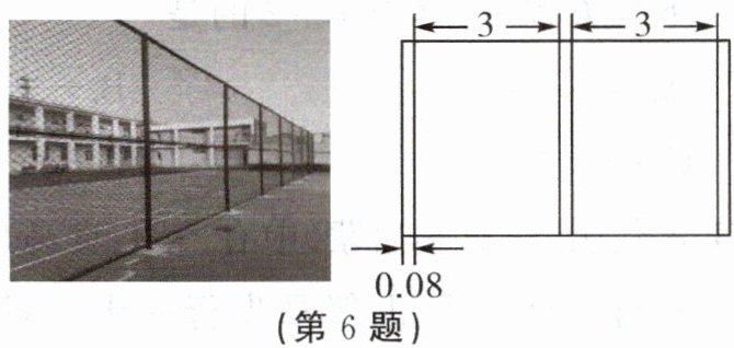 6. 为保障校园体育活动安全有序开展,学校计划在足球场四周安装防护栏.如图,每根立柱的直径为0.08m,相邻两根立柱之间设置一张防护网,每张防护网长3m.