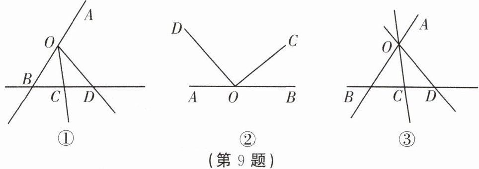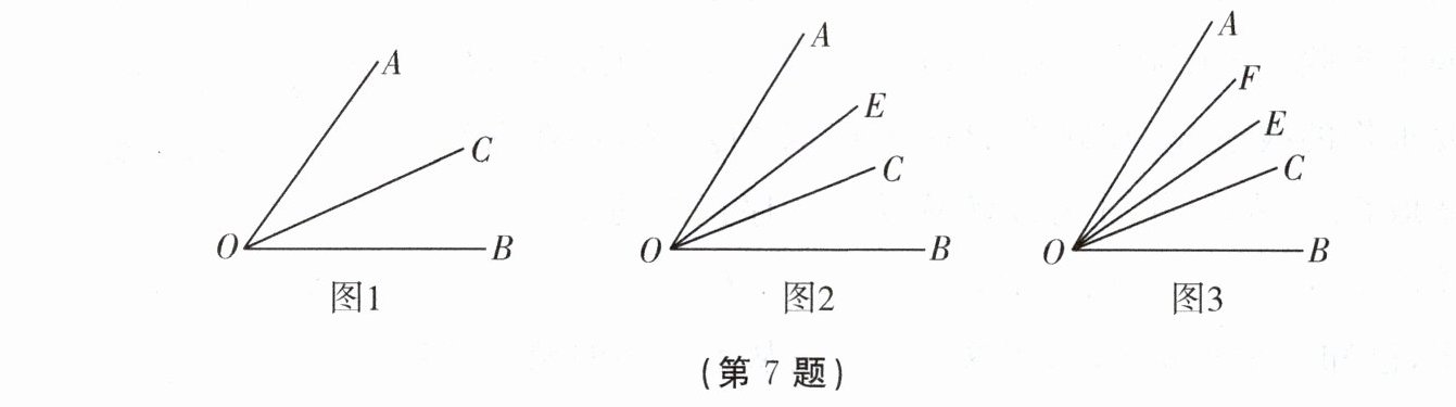 8. 比较$∠AOB$与$∠A'O'B'$的大小时,把点$O$与点$O'$重合,射线$OA$与$O'A'$重合,射线$OB$与$O'B'$放在$OA$的同侧,若$OB$落在$∠A'O'B'$的外部,则$∠AOB$