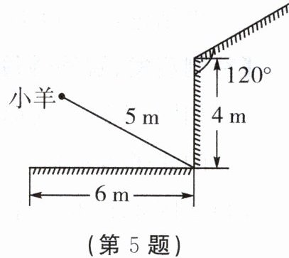 5. 如图,一根 5 m 长的绳子,一端拴在成 $ 90^{\circ} $ 的围墙墙角的柱子上,另一端拴着一只小羊(小羊只能在草地上活动),求小羊在草地上可活动区域的面积.(结果保留 $ \pi $)
