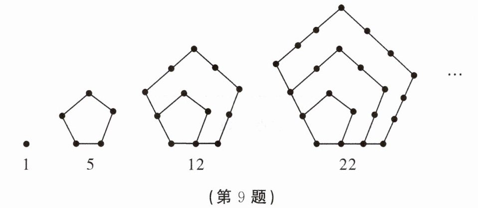 9. 古希腊人常用小石子在沙滩上摆成各种形状来研究数.如图,我们称图中的数 1,5,12,22,…为五边形数,则第 6 个五边形数是