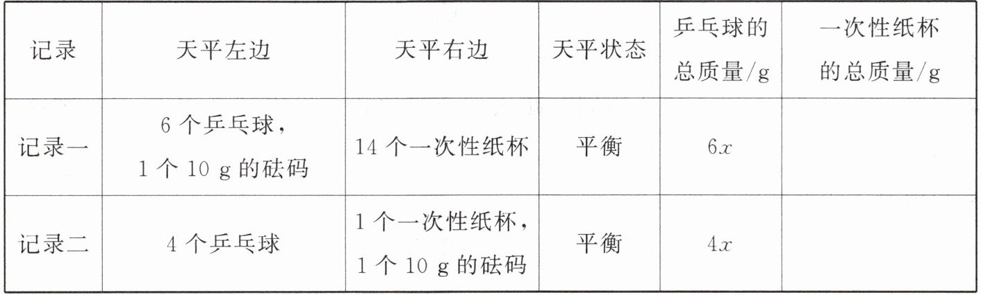 【实验探究】准备若干相同的乒乓球和若干相同的一次性纸杯(每个乒乓球的质量相同,每个纸杯的质量也相同),设一个乒乓球的质量是 $x$ g,经过试验,将有关信息记录在下表中: